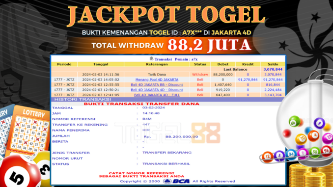 TOGEL88 JACKPOT TOGEL JAKARTA 4D Rp 88.200.000,- LUNAS