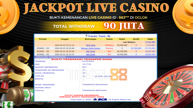 TOGEL88 JACKPOT LIVE CASINO DI OGLOK Rp 90.000.000,- LUNAS