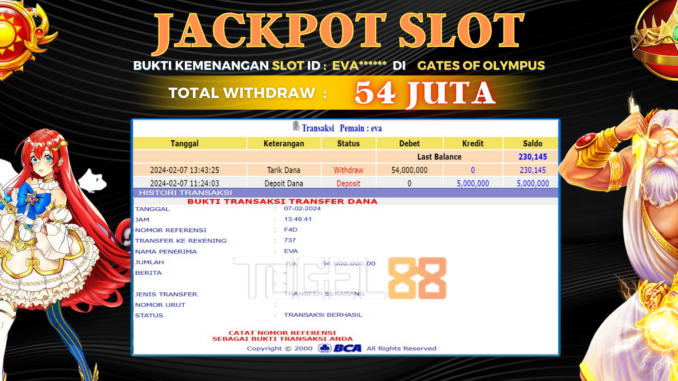 TOGEL88 mengucapkan selamat kepada user id : EVA*** yang telah berhasil mendapatkan jackpot pada permainan SLOT DI GATES OF OLYMPUS. Kemenangan sebesar Rp 54.000.000,-. telah dibayarkan LUNAS oleh pihak TOGEL88 kepada pemilik user id setelah yang bersangkutan mengisi formulir withdraw. Proses pencairan dana berlangsung sangat cepat hanya dalam waktu 5-10 menit sudah berada dalam rekening pemilik user id. Bukti transfer yang dapat anda lihat adalah bukti SAH / VALID yang langsung di dapatkan melalui bukti transaksi dari Bank yang digunakan untuk pengiriman dana pada rekening pemilik user id. Terima kasih kami sampaikan kepada para pengguna setia TOGEL88 yang telah menggunakan situs kami, sebagai Bandar Terpercaya yang pastinya membayar semua kemenangan member hingga lunas. Apakah TOGEL88 PENIPU ? Reputasi “TOGEL88 TERPERCAYA” sudah sangat melekat. puluhan hingga ratusan ribu pengguna setia TOGEL88 tetap menggunakan situs terbesar dan terbaik di Indonesia ini. Hapus rasa was-was dan khawatir anda, kemenangan anda berapapun PASTI dibayarkan hingga lunas.