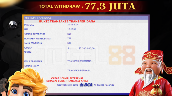 TOGEL88 mengucapkan selamat kepada user id : RUD*** yang telah berhasil mendapatkan jackpot pada permainan SLOT DI 5000X MANIA. Kemenangan sebesar Rp 77.300.000,-. telah dibayarkan LUNAS oleh pihak TOGEL88 kepada pemilik user id setelah yang bersangkutan mengisi formulir withdraw. Proses pencairan dana berlangsung sangat cepat hanya dalam waktu 5-10 menit sudah berada dalam rekening pemilik user id. Bukti transfer yang dapat anda lihat adalah bukti SAH / VALID yang langsung di dapatkan melalui bukti transaksi dari Bank yang digunakan untuk pengiriman dana pada rekening pemilik user id. Terima kasih kami sampaikan kepada para pengguna setia TOGEL88 yang telah menggunakan situs kami, sebagai Bandar Terpercaya yang pastinya membayar semua kemenangan member hingga lunas. Apakah TOGEL88 PENIPU ? Reputasi “TOGEL88 TERPERCAYA” sudah sangat melekat. puluhan hingga ratusan ribu pengguna setia TOGEL88 tetap menggunakan situs terbesar dan terbaik di Indonesia ini. Hapus rasa was-was dan khawatir anda, kemenangan anda berapapun PASTI dibayarkan hingga lunas.