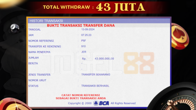 TOGEL88 mengucapkan selamat kepada user id : JER*** yang telah berhasil mendapatkan jackpot pada permainan LIVE CASINO di HEAD TAIL . Kemenangan sebesar Rp 45.000.000,-. telah dibayarkan LUNAS oleh pihak TOGEL88 kepada pemilik user id setelah yang bersangkutan mengisi formulir withdraw. Proses pencairan dana berlangsung sangat cepat hanya dalam waktu 5-10 menit sudah berada dalam rekening pemilik user id. Bukti transfer yang dapat anda lihat adalah bukti SAH / VALID yang langsung di dapatkan melalui bukti transaksi dari Bank yang digunakan untuk pengiriman dana pada rekening pemilik user id. Terima kasih kami sampaikan kepada para pengguna setia TOGEL88 yang telah menggunakan situs kami, sebagai Bandar Terpercaya yang pastinya membayar semua kemenangan member hingga lunas. Apakah TOGEL88 PENIPU ? Reputasi “TOGEL88 TERPERCAYA” sudah sangat melekat. puluhan hingga ratusan ribu pengguna setia TOGEL88 tetap menggunakan situs terbesar dan terbaik di Indonesia ini. Hapus rasa was-was dan khawatir anda, kemenangan anda berapapun PASTI dibayarkan hingga lunas.