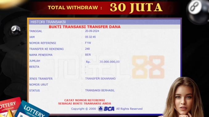 TOGEL88 mengucapkan selamat kepada user id : BER*** yang telah berhasil mendapatkan jackpot pada permainan TOGEL DI CORDOBA 4D. Kemenangan sebesar Rp 30.000.000,-. telah dibayarkan LUNAS oleh pihak TOGEL88 kepada pemilik user id setelah yang bersangkutan mengisi formulir withdraw. Proses pencairan dana berlangsung sangat cepat hanya dalam waktu 5-10 menit sudah berada dalam rekening pemilik user id. Bukti transfer yang dapat anda lihat adalah bukti SAH / VALID yang langsung di dapatkan melalui bukti transaksi dari Bank yang digunakan untuk pengiriman dana pada rekening pemilik user id. Terima kasih kami sampaikan kepada para pengguna setia TOGEL88 yang telah menggunakan situs kami, sebagai Bandar Terpercaya yang pastinya membayar semua kemenangan member hingga lunas. Apakah TOGEL88 PENIPU ? Reputasi “TOGEL88 TERPERCAYA” sudah sangat melekat. puluhan hingga ratusan ribu pengguna setia TOGEL88 tetap menggunakan situs terbesar dan terbaik di Indonesia ini. Hapus rasa was-was dan khawatir anda, kemenangan anda berapapun PASTI dibayarkan hingga lunas.