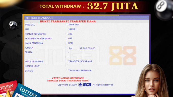 TOGEL88 mengucapkan selamat kepada user id : SAR*** yang telah berhasil mendapatkan jackpot pada permainan TOGEL DI SINGAPORE POOLS. Kemenangan sebesar Rp 32.700.000,-. telah dibayarkan LUNAS oleh pihak TOGEL88 kepada pemilik user id setelah yang bersangkutan mengisi formulir withdraw. Proses pencairan dana berlangsung sangat cepat hanya dalam waktu 5-10 menit sudah berada dalam rekening pemilik user id. Bukti transfer yang dapat anda lihat adalah bukti SAH / VALID yang langsung di dapatkan melalui bukti transaksi dari Bank yang digunakan untuk pengiriman dana pada rekening pemilik user id. Terima kasih kami sampaikan kepada para pengguna setia TOGEL88 yang telah menggunakan situs kami, sebagai Bandar Terpercaya yang pastinya membayar semua kemenangan member hingga lunas. Apakah TOGEL88 PENIPU ? Reputasi “TOGEL88 TERPERCAYA” sudah sangat melekat. puluhan hingga ratusan ribu pengguna setia TOGEL88 tetap menggunakan situs terbesar dan terbaik di Indonesia ini. Hapus rasa was-was dan khawatir anda, kemenangan anda berapapun PASTI dibayarkan hingga lunas.