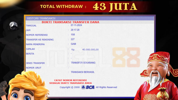 TOGEL88 mengucapkan selamat kepada user id : GAM*** yang telah berhasil mendapatkan jackpot pada permainan SLOT DI KUTUKAN MEDUSA. Kemenangan sebesar Rp 43.000.000,-. telah dibayarkan LUNAS oleh pihak TOGEL88 kepada pemilik user id setelah yang bersangkutan mengisi formulir withdraw. Proses pencairan dana berlangsung sangat cepat hanya dalam waktu 5-10 menit sudah berada dalam rekening pemilik user id. Bukti transfer yang dapat anda lihat adalah bukti SAH / VALID yang langsung di dapatkan melalui bukti transaksi dari Bank yang digunakan untuk pengiriman dana pada rekening pemilik user id. Terima kasih kami sampaikan kepada para pengguna setia TOGEL88 yang telah menggunakan situs kami, sebagai Bandar Terpercaya yang pastinya membayar semua kemenangan member hingga lunas. Apakah TOGEL88 PENIPU ? Reputasi “TOGEL88 TERPERCAYA” sudah sangat melekat. puluhan hingga ratusan ribu pengguna setia TOGEL88 tetap menggunakan situs terbesar dan terbaik di Indonesia ini. Hapus rasa was-was dan khawatir anda, kemenangan anda berapapun PASTI dibayarkan hingga lunas.