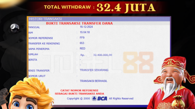 TOGEL88 mengucapkan selamat kepada user id : DER*** yang telah berhasil mendapatkan jackpot pada permainan SLOT DI GATES OF GATOT KACA. Kemenangan sebesar Rp 32.400.000,-. telah dibayarkan LUNAS oleh pihak TOGEL88 kepada pemilik user id setelah yang bersangkutan mengisi formulir withdraw. Proses pencairan dana berlangsung sangat cepat hanya dalam waktu 5-10 menit sudah berada dalam rekening pemilik user id. Bukti transfer yang dapat anda lihat adalah bukti SAH / VALID yang langsung di dapatkan melalui bukti transaksi dari Bank yang digunakan untuk pengiriman dana pada rekening pemilik user id. Terima kasih kami sampaikan kepada para pengguna setia TOGEL88 yang telah menggunakan situs kami, sebagai Bandar Terpercaya yang pastinya membayar semua kemenangan member hingga lunas. Apakah TOGEL88 PENIPU ? Reputasi “TOGEL88 TERPERCAYA” sudah sangat melekat. puluhan hingga ratusan ribu pengguna setia TOGEL88 tetap menggunakan situs terbesar dan terbaik di Indonesia ini. Hapus rasa was-was dan khawatir anda, kemenangan anda berapapun PASTI dibayarkan hingga lunas.