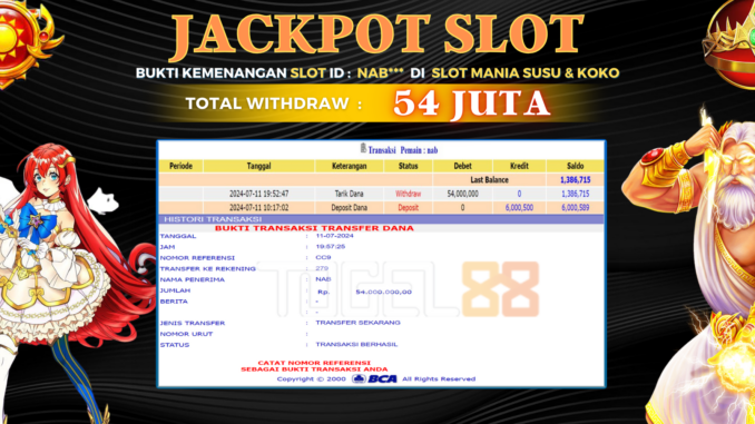 TOGEL88 JACKPOT SLOT DI SLOT MANIA SUSU & KOKO Rp 54.000.000,- LUNAS
