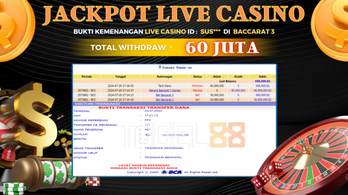 TOGEL88 JACKPOT SLOT DI LIVE CASINO di BACCARAT 3 Rp 60.000.000,- LUNAS