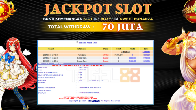 TOGEL88 mengucapkan selamat kepada user id : BOX*** yang telah berhasil mendapatkan jackpot pada permainan SLOT DI SWEET BONANZA. Kemenangan sebesar Rp 70.000.000,-. telah dibayarkan LUNAS oleh pihak TOGEL88 kepada pemilik user id setelah yang bersangkutan mengisi formulir withdraw. Proses pencairan dana berlangsung sangat cepat hanya dalam waktu 5-10 menit sudah berada dalam rekening pemilik user id. Bukti transfer yang dapat anda lihat adalah bukti SAH / VALID yang langsung di dapatkan melalui bukti transaksi dari Bank yang digunakan untuk pengiriman dana pada rekening pemilik user id. Terima kasih kami sampaikan kepada para pengguna setia TOGEL88 yang telah menggunakan situs kami, sebagai Bandar Terpercaya yang pastinya membayar semua kemenangan member hingga lunas. Apakah TOGEL88 PENIPU ? Reputasi “TOGEL88 TERPERCAYA” sudah sangat melekat. puluhan hingga ratusan ribu pengguna setia TOGEL88 tetap menggunakan situs terbesar dan terbaik di Indonesia ini. Hapus rasa was-was dan khawatir anda, kemenangan anda berapapun PASTI dibayarkan hingga lunas.
