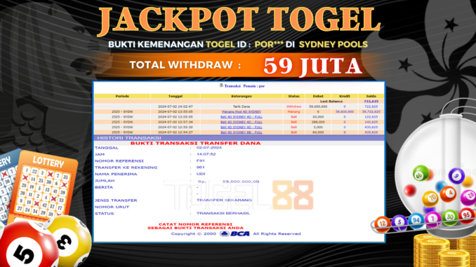 MEMBER TOGEL88 MENERIMA PELUNASAN JACKPOT SLOT TOGEL di SYDNEY POOLS Rp 59.000.000,- LUNAS