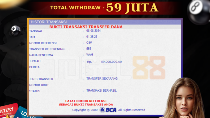 TOGEL88 mengucapkan selamat kepada user id : WAH*** yang telah berhasil mendapatkan jackpot pada permainan TOGEL DI TOTOMACAU 4D. Kemenangan sebesar Rp 59.000.000,-. telah dibayarkan LUNAS oleh pihak TOGEL88 kepada pemilik user id setelah yang bersangkutan mengisi formulir withdraw. Proses pencairan dana berlangsung sangat cepat hanya dalam waktu 5-10 menit sudah berada dalam rekening pemilik user id. Bukti transfer yang dapat anda lihat adalah bukti SAH / VALID yang langsung di dapatkan melalui bukti transaksi dari Bank yang digunakan untuk pengiriman dana pada rekening pemilik user id. Terima kasih kami sampaikan kepada para pengguna setia TOGEL88 yang telah menggunakan situs kami, sebagai Bandar Terpercaya yang pastinya membayar semua kemenangan member hingga lunas. Apakah TOGEL88 PENIPU ? Reputasi “TOGEL88 TERPERCAYA” sudah sangat melekat. puluhan hingga ratusan ribu pengguna setia TOGEL88 tetap menggunakan situs terbesar dan terbaik di Indonesia ini. Hapus rasa was-was dan khawatir anda, kemenangan anda berapapun PASTI dibayarkan hingga lunas.