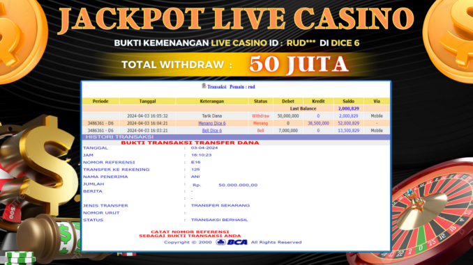 TOGEL88 JACKPOT LIVE CASINO DI DICE 6 Rp 50.000.000,- LUNAS