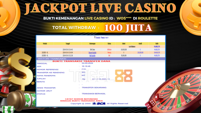 TOGEL88 JACKPOT LIVE CASINO DI ROULETTE Rp 100.000.000,- LUNAS