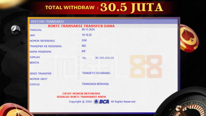 TOGEL88 mengucapkan selamat kepada user id : RIF*** yang telah berhasil mendapatkan jackpot pada permainan LIVE CASINO DI DRAGON TIGER. Kemenangan sebesar Rp 30.500.000,-. telah dibayarkan LUNAS oleh pihak TOGEL88 kepada pemilik user id setelah yang bersangkutan mengisi formulir withdraw. Proses pencairan dana berlangsung sangat cepat hanya dalam waktu 5-10 menit sudah berada dalam rekening pemilik user id. Bukti transfer yang dapat anda lihat adalah bukti SAH / VALID yang langsung di dapatkan melalui bukti transaksi dari Bank yang digunakan untuk pengiriman dana pada rekening pemilik user id. Terima kasih kami sampaikan kepada para pengguna setia TOGEL88 yang telah menggunakan situs kami, sebagai Bandar Terpercaya yang pastinya membayar semua kemenangan member hingga lunas. Apakah TOGEL88 PENIPU ? Reputasi “TOGEL88 TERPERCAYA” sudah sangat melekat. puluhan hingga ratusan ribu pengguna setia TOGEL88 tetap menggunakan situs terbesar dan terbaik di Indonesia ini. Hapus rasa was-was dan khawatir anda, kemenangan anda berapapun PASTI dibayarkan hingga lunas.