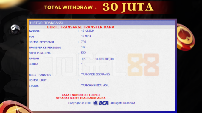 TOGEL88 mengucapkan selamat kepada user id : DIO*** yang telah berhasil mendapatkan jackpot pada permainan LIVE CASINO DI BACCARAT. Kemenangan sebesar Rp 30.000.000,-. telah dibayarkan LUNAS oleh pihak TOGEL88 kepada pemilik user id setelah yang bersangkutan mengisi formulir withdraw. Proses pencairan dana berlangsung sangat cepat hanya dalam waktu 5-10 menit sudah berada dalam rekening pemilik user id. Bukti transfer yang dapat anda lihat adalah bukti SAH / VALID yang langsung di dapatkan melalui bukti transaksi dari Bank yang digunakan untuk pengiriman dana pada rekening pemilik user id. Terima kasih kami sampaikan kepada para pengguna setia TOGEL88 yang telah menggunakan situs kami, sebagai Bandar Terpercaya yang pastinya membayar semua kemenangan member hingga lunas. Apakah TOGEL88 PENIPU ? Reputasi “TOGEL88 TERPERCAYA” sudah sangat melekat. puluhan hingga ratusan ribu pengguna setia TOGEL88 tetap menggunakan situs terbesar dan terbaik di Indonesia ini. Hapus rasa was-was dan khawatir anda, kemenangan anda berapapun PASTI dibayarkan hingga lunas.