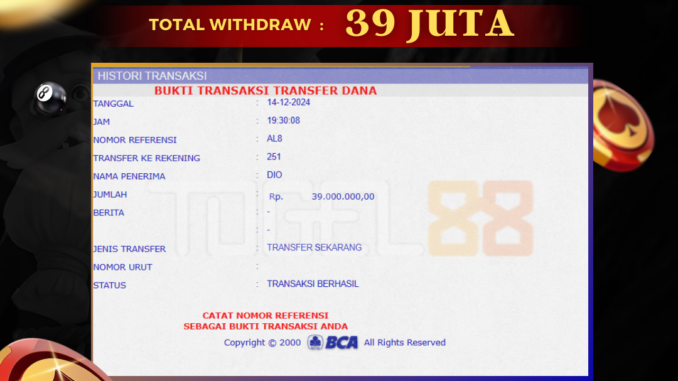 TOGEL88 mengucapkan selamat kepada user id : MAN*** yang telah berhasil mendapatkan jackpot pada permainan LIVE CASINO DI DRAGON TIGER Kemenangan sebesar Rp 39.000.000,-. telah dibayarkan LUNAS oleh pihak TOGEL88 kepada pemilik user id setelah yang bersangkutan mengisi formulir withdraw. Proses pencairan dana berlangsung sangat cepat hanya dalam waktu 5-10 menit sudah berada dalam rekening pemilik user id. Bukti transfer yang dapat anda lihat adalah bukti SAH / VALID yang langsung di dapatkan melalui bukti transaksi dari Bank yang digunakan untuk pengiriman dana pada rekening pemilik user id. Terima kasih kami sampaikan kepada para pengguna setia TOGEL88 yang telah menggunakan situs kami, sebagai Bandar Terpercaya yang pastinya membayar semua kemenangan member hingga lunas. Apakah TOGEL88 PENIPU ? Reputasi “TOGEL88 TERPERCAYA” sudah sangat melekat. puluhan hingga ratusan ribu pengguna setia TOGEL88 tetap menggunakan situs terbesar dan terbaik di Indonesia ini. Hapus rasa was-was dan khawatir anda, kemenangan anda berapapun PASTI dibayarkan hingga lunas.