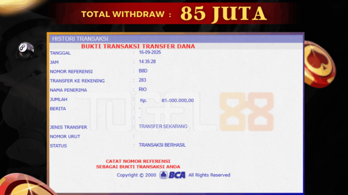 TOGEL88 mengucapkan selamat kepada user id : REN*** yang telah berhasil mendapatkan jackpot pada permainan TOGEL DI SYDNEY LOTTO. Kemenangan sebesar Rp 85.000.000,-. telah dibayarkan LUNAS oleh pihak TOGEL88 kepada pemilik user id setelah yang bersangkutan mengisi formulir withdraw. Proses pencairan dana berlangsung sangat cepat hanya dalam waktu 5-10 menit sudah berada dalam rekening pemilik user id. Bukti transfer yang dapat anda lihat adalah bukti SAH / VALID yang langsung di dapatkan melalui bukti transaksi dari Bank yang digunakan untuk pengiriman dana pada rekening pemilik user id. Terima kasih kami sampaikan kepada para pengguna setia TOGEL88 yang telah menggunakan situs kami, sebagai Bandar Terpercaya yang pastinya membayar semua kemenangan member hingga lunas. Apakah TOGEL88 PENIPU ? Reputasi “TOGEL88 TERPERCAYA” sudah sangat melekat. puluhan hingga ratusan ribu pengguna setia TOGEL88 tetap menggunakan situs terbesar dan terbaik di Indonesia ini. Hapus rasa was-was dan khawatir anda, kemenangan anda berapapun PASTI dibayarkan hingga lunas.