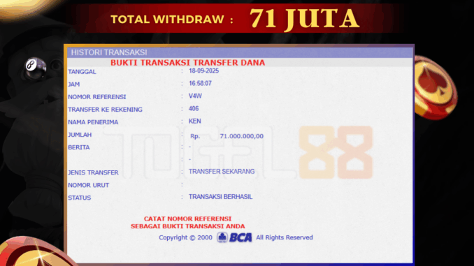 TOGEL88 mengucapkan selamat kepada user id : CAL*** yang telah berhasil mendapatkan jackpot pada permainan LIVE CASINO DI DRAGON TIGER. Kemenangan sebesar Rp 71.000.000,-. telah dibayarkan LUNAS oleh pihak TOGEL88 kepada pemilik user id setelah yang bersangkutan mengisi formulir withdraw. Proses pencairan dana berlangsung sangat cepat hanya dalam waktu 5-10 menit sudah berada dalam rekening pemilik user id. Bukti transfer yang dapat anda lihat adalah bukti SAH / VALID yang langsung di dapatkan melalui bukti transaksi dari Bank yang digunakan untuk pengiriman dana pada rekening pemilik user id. Terima kasih kami sampaikan kepada para pengguna setia TOGEL88 yang telah menggunakan situs kami, sebagai Bandar Terpercaya yang pastinya membayar semua kemenangan member hingga lunas. Apakah TOGEL88 PENIPU ? Reputasi “TOGEL88 TERPERCAYA” sudah sangat melekat. puluhan hingga ratusan ribu pengguna setia TOGEL88 tetap menggunakan situs terbesar dan terbaik di Indonesia ini. Hapus rasa was-was dan khawatir anda, kemenangan anda berapapun PASTI dibayarkan hingga lunas.