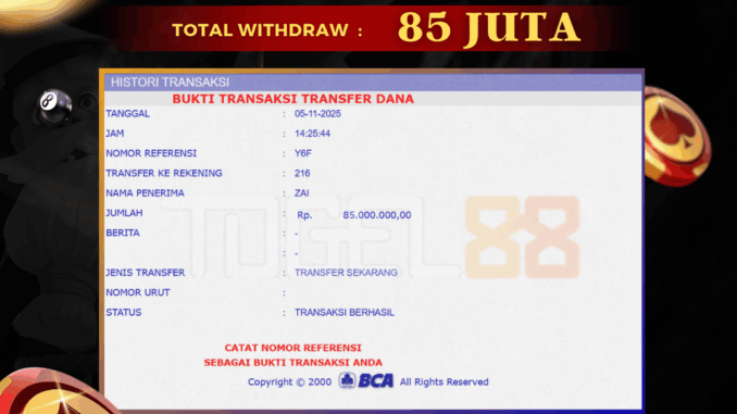TOGEL88 mengucapkan selamat kepada user id : ZAI*** yang telah berhasil mendapatkan jackpot pada permainan LIVE CASINO DI ROULETTE. Kemenangan sebesar Rp 85.000.000,-. telah dibayarkan LUNAS oleh pihak TOGEL88 kepada pemilik user id setelah yang bersangkutan mengisi formulir withdraw. Proses pencairan dana berlangsung sangat cepat hanya dalam waktu 5-10 menit sudah berada dalam rekening pemilik user id. Bukti transfer yang dapat anda lihat adalah bukti SAH / VALID yang langsung di dapatkan melalui bukti transaksi dari Bank yang digunakan untuk pengiriman dana pada rekening pemilik user id. Terima kasih kami sampaikan kepada para pengguna setia TOGEL88 yang telah menggunakan situs kami, sebagai Bandar Terpercaya yang pastinya membayar semua kemenangan member hingga lunas. Apakah TOGEL88 PENIPU ? Reputasi “TOGEL88 TERPERCAYA” sudah sangat melekat. puluhan hingga ratusan ribu pengguna setia TOGEL88 tetap menggunakan situs terbesar dan terbaik di Indonesia ini. Hapus rasa was-was dan khawatir anda, kemenangan anda berapapun PASTI dibayarkan hingga lunas.