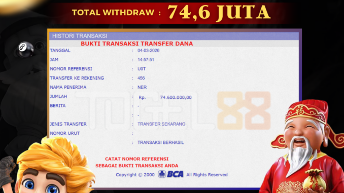 TOGEL88 mengucapkan selamat kepada user id : HEN*** yang telah berhasil mendapatkan jackpot pada permainan ARCADE DI SPACEMAN. Kemenangan sebesar Rp 74.600.000,-. telah dibayarkan LUNAS oleh pihak TOGEL88 kepada pemilik user id setelah yang bersangkutan mengisi formulir withdraw. Proses pencairan dana berlangsung sangat cepat hanya dalam waktu 5-10 menit sudah berada dalam rekening pemilik user id. Bukti transfer yang dapat anda lihat adalah bukti SAH / VALID yang langsung di dapatkan melalui bukti transaksi dari Bank yang digunakan untuk pengiriman dana pada rekening pemilik user id. Terima kasih kami sampaikan kepada para pengguna setia TOGEL88 yang telah menggunakan situs kami, sebagai Bandar Terpercaya yang pastinya membayar semua kemenangan member hingga lunas. Apakah TOGEL88 PENIPU ? Reputasi “TOGEL88 TERPERCAYA” sudah sangat melekat. puluhan hingga ratusan ribu pengguna setia TOGEL88 tetap menggunakan situs terbesar dan terbaik di Indonesia ini. Hapus rasa was-was dan khawatir anda, kemenangan anda berapapun PASTI dibayarkan hingga lunas.