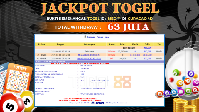 TOGEL88 JACKPOT TOGEL DI CURACAO 4D Rp 63.000.000,- LUNAS