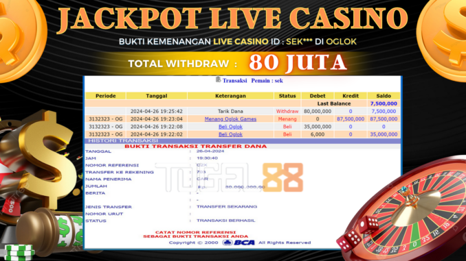 TOGEL88 JACKPOT LIVE CASINO DI OGLOK Rp 80.000.000,- LUNAS