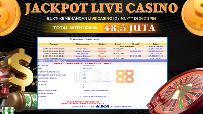MEMBER TOGEL88 MENERIMA PELUNASAN KEMENANGAN JACKPOT LIVE CASINO DI 24D SPIN Rp 48.500.000,- LUNAS