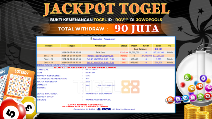 TOGEL88 mengucapkan selamat kepada user id : ROV*** yang telah berhasil mendapatkan jackpot pada permainan TOGEL DI JOWOPOOLS. Kemenangan sebesar Rp 90.000.000,-. telah dibayarkan LUNAS oleh pihak TOGEL88 kepada pemilik user id setelah yang bersangkutan mengisi formulir withdraw. Proses pencairan dana berlangsung sangat cepat hanya dalam waktu 5-10 menit sudah berada dalam rekening pemilik user id. Bukti transfer yang dapat anda lihat adalah bukti SAH / VALID yang langsung di dapatkan melalui bukti transaksi dari Bank yang digunakan untuk pengiriman dana pada rekening pemilik user id. Terima kasih kami sampaikan kepada para pengguna setia TOGEL88 yang telah menggunakan situs kami, sebagai Bandar Terpercaya yang pastinya membayar semua kemenangan member hingga lunas. Apakah TOGEL88 PENIPU ? Reputasi “TOGEL88 TERPERCAYA” sudah sangat melekat. puluhan hingga ratusan ribu pengguna setia TOGEL88 tetap menggunakan situs terbesar dan terbaik di Indonesia ini. Hapus rasa was-was dan khawatir anda, kemenangan anda berapapun PASTI dibayarkan hingga lunas.