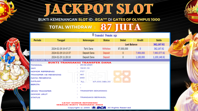 TOGEL88 mengucapkan selamat kepada user id : EGA*** yang telah berhasil mendapatkan jackpot pada permainan SLOT DI GATES OF OLYMPUS 1000. Kemenangan sebesar Rp 87.000.000,-. telah dibayarkan LUNAS oleh pihak TOGEL88 kepada pemilik user id setelah yang bersangkutan mengisi formulir withdraw. Proses pencairan dana berlangsung sangat cepat hanya dalam waktu 5-10 menit sudah berada dalam rekening pemilik user id. Bukti transfer yang dapat anda lihat adalah bukti SAH / VALID yang langsung di dapatkan melalui bukti transaksi dari Bank yang digunakan untuk pengiriman dana pada rekening pemilik user id. Terima kasih kami sampaikan kepada para pengguna setia TOGEL88 yang telah menggunakan situs kami, sebagai Bandar Terpercaya yang pastinya membayar semua kemenangan member hingga lunas. Apakah TOGEL88 PENIPU ? Reputasi “TOGEL88 TERPERCAYA” sudah sangat melekat. puluhan hingga ratusan ribu pengguna setia TOGEL88 tetap menggunakan situs terbesar dan terbaik di Indonesia ini. Hapus rasa was-was dan khawatir anda, kemenangan anda berapapun PASTI dibayarkan hingga lunas.
